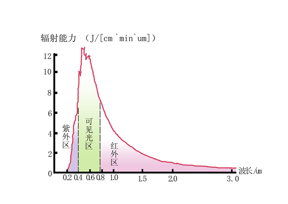 太陽光的極為寬闊的連續(xù)譜以及數(shù)以萬計的吸收線和發(fā)射線,是一個極為豐富的太陽信息寶藏。太陽光譜屬于G2V光譜型,有效溫度為5770 K。太陽電磁輻射中99.9% 的能量集中在紅外區(qū)、可見光區(qū)和紫外區(qū)。在地面上觀測的太陽輻射的波段范圍大約為0.295~2.5um。短于0.295um和大于2.5um波長的太陽輻射,因地球大氣中臭氧、水氣和其他大氣分子的強烈吸收,不能到達地面。